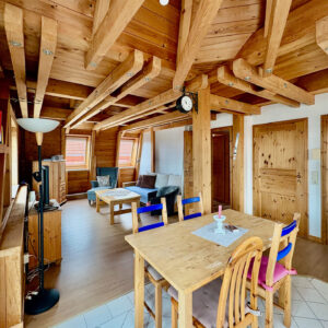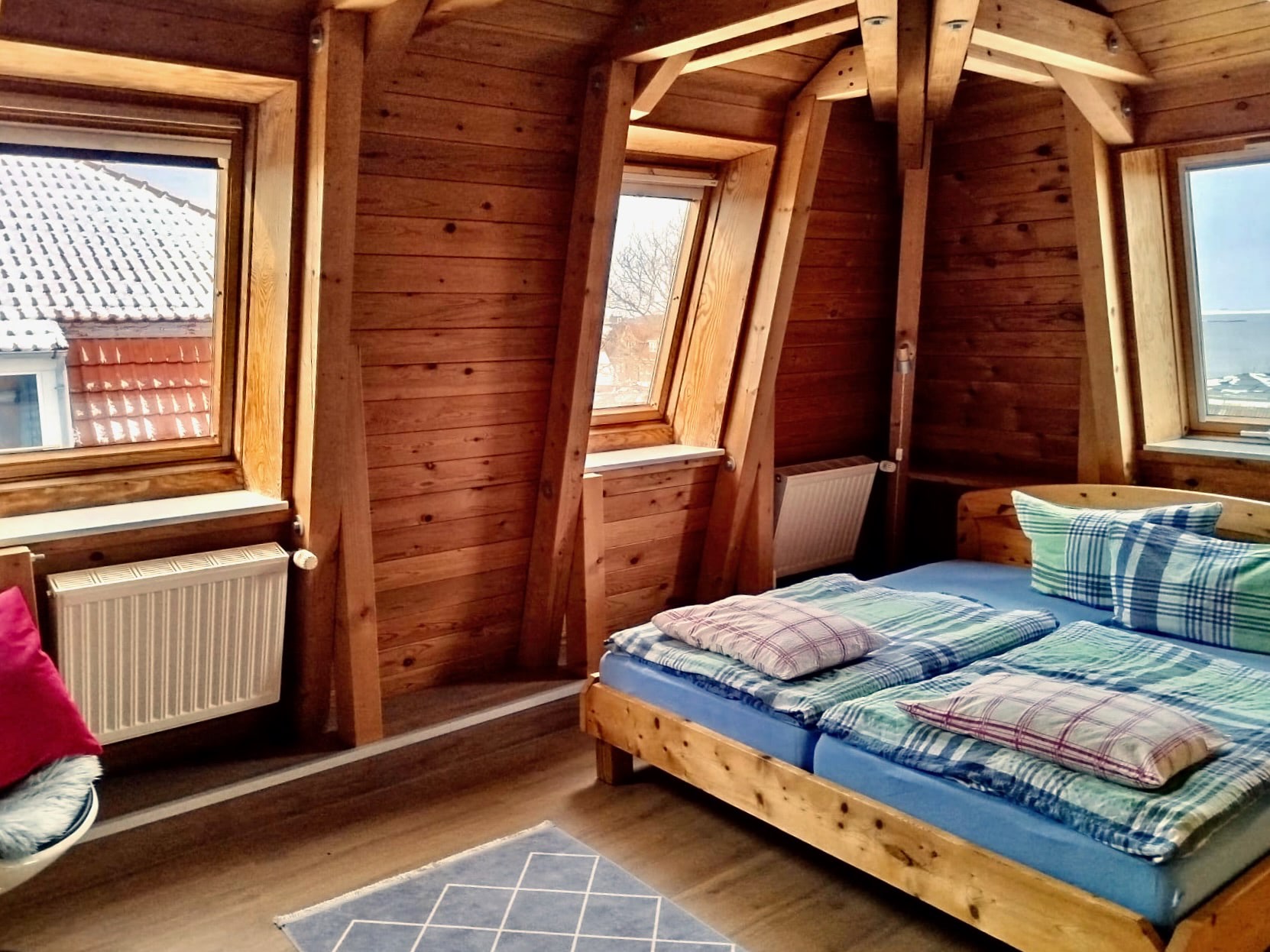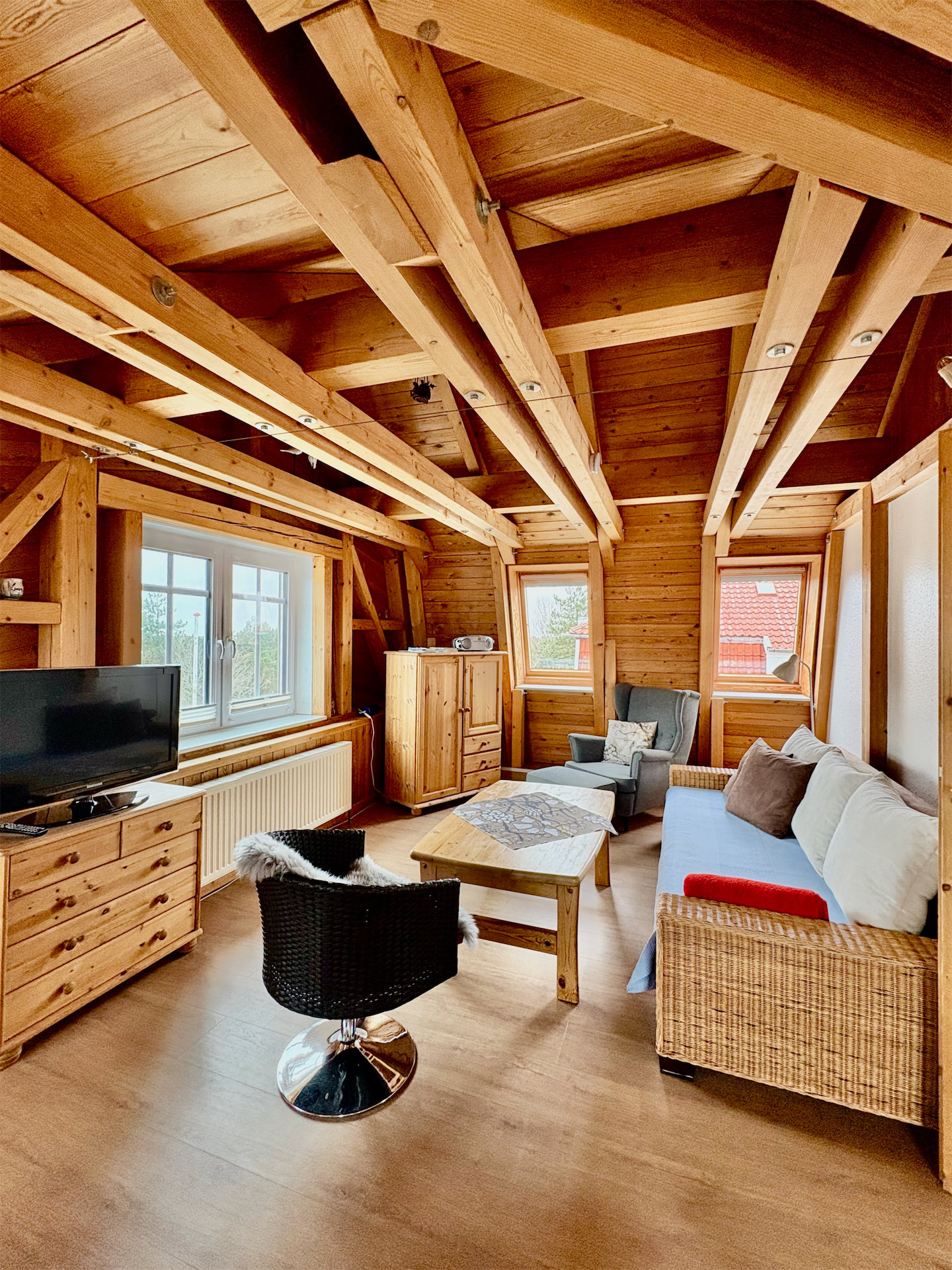 Highlight, außer dem wunderbaren Blick, ist der komplett sichtbare Dachstuhl, aus naturbelassenem Holz.